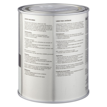 Voor een optimaal resultaat van de GAMMA binnenlak behandel je de ondergrond eerst met de GAMMA grondverf voor binnen. Het blik heeft een inhoud van 750 milliliter, dit is voldoende voor een oppervlakte van ongeveer 9 m². Een uur na het aanbrengen van de verf is deze reeds stofdroog, na 20 uur kan je de volgende laag aanbrengen. Verwerk de verf bij temperaturen tussen de 8 en 25°C.