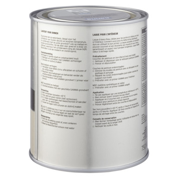 Voor een optimaal resultaat van de GAMMA binnenlak behandel je de ondergrond eerst met de GAMMA grondverf voor binnen. Het blik heeft een inhoud van 750 milliliter, dit is voldoende voor een oppervlakte van ongeveer 9 m². Een uur na het aanbrengen van de verf is deze reeds stofdroog, na 20 uur kan je de volgende laag aanbrengen. Verwerk de verf bij temperaturen tussen de 8 en 25°C.