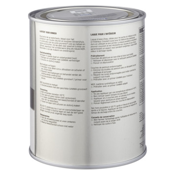 Voor een optimaal resultaat van de GAMMA binnenlak behandel je de ondergrond eerst met de GAMMA grondverf voor binnen. Het blik heeft een inhoud van 750 milliliter, dit is voldoende voor een oppervlakte van ongeveer 9 m². Een uur na het aanbrengen van de verf is deze reeds stofdroog, na 20 uur kan je de volgende laag aanbrengen. Verwerk de verf bij temperaturen tussen de 8 en 25°C.
