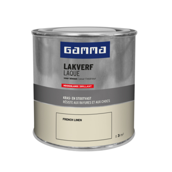 De GAMMA binnenlak hoogglans french linen 250 ml is geschikt voor het schilderen van onder andere deuren, kozijnen en meubels binnenshuis. Deze kras- en stootvaste lak beschermt oppervlakken goed en geeft ze een strakke hoogglans afwerking. De lak is op waterbasis, waardoor hij geurarm is en minder snel vergeelt. Je kunt hem direct op hout aanbrengen, en in combinatie met een geschikte grondverf ook op metaal en kunststof. De verf is stofdroog na 1 uur en overschilderbaar na 12 uur.