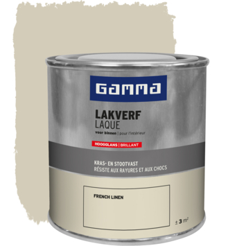De GAMMA binnenlak hoogglans french linen 250 ml is geschikt voor het schilderen van onder andere deuren, kozijnen en meubels binnenshuis. Deze kras- en stootvaste lak beschermt oppervlakken goed en geeft ze een strakke hoogglans afwerking. De lak is op waterbasis, waardoor hij geurarm is en minder snel vergeelt. Je kunt hem direct op hout aanbrengen, en in combinatie met een geschikte grondverf ook op metaal en kunststof. De verf is stofdroog na 1 uur en overschilderbaar na 12 uur. Met een blik van 250 ml kun je ongeveer 3 m² schilderen. Voor het beste resultaat verwerk je de lak bij temperaturen tussen 8 en 25°C. Je brengt de verf eenvoudig aan met een kwast of lakroller voor verf op waterbasis. GAMMA heeft deze binnenlak in 14 kleuren en 3 glansgraden: hoogglans, zijdeglans en mat. Zit jouw kleur er niet bij? Dan kan een verfspecialist een kleur op maat mengen in de bouwmarkt.