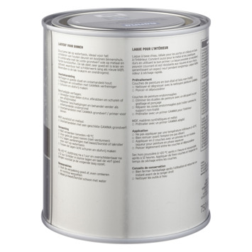 Voor een optimaal resultaat van de GAMMA binnenlak behandel je de ondergrond eerst met de GAMMA grondverf voor binnen. Het blik heeft een inhoud van 750 milliliter, dit is voldoende voor een oppervlakte van ongeveer 9 m². Een uur na het aanbrengen van de verf is deze reeds stofdroog, na 20 uur kan je de volgende laag aanbrengen. Verwerk de verf bij temperaturen tussen de 8 en 25°C.