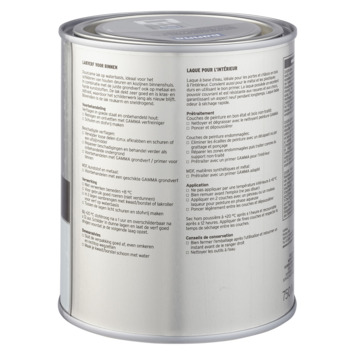 Voor een optimaal resultaat van de GAMMA binnenlak behandel je de ondergrond eerst met de GAMMA grondverf voor binnen. Het blik heeft een inhoud van 750 milliliter, dit is voldoende voor een oppervlakte van ongeveer 9 m². Een uur na het aanbrengen van de verf is deze reeds stofdroog, na 20 uur kan je de volgende laag aanbrengen. Verwerk de verf bij temperaturen tussen de 8 en 25°C.