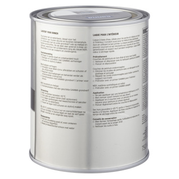 Voor een optimaal resultaat van de GAMMA binnenlak behandel je de ondergrond eerst met de GAMMA grondverf voor binnen. Het blik heeft een inhoud van 750 milliliter, dit is voldoende voor een oppervlakte van ongeveer 9 m². Een uur na het aanbrengen van de verf is deze reeds stofdroog, na 20 uur kan je de volgende laag aanbrengen. Verwerk de verf bij temperaturen tussen de 8 en 25°C.