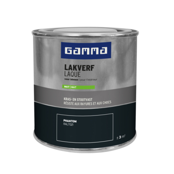 De GAMMA binnenlak mat RAL 7021 phantom 250 ml is geschikt voor het schilderen van onder andere deuren, kozijnen en meubels binnenshuis. Deze kras- en stootvaste lak beschermt oppervlakken goed en geeft ze een strakke matte afwerking. De lak is op waterbasis, waardoor hij geurarm is en minder snel vergeelt. Je kunt hem direct op hout aanbrengen, en in combinatie met een geschikte grondverf ook op metaal en kunststof. De verf is stofdroog na 1 uur en overschilderbaar na 12 uur.