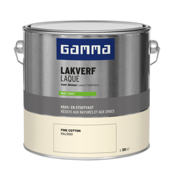 De GAMMA binnenlak mat RAL 9001 fine cotton 2,5 liter is geschikt voor het schilderen van onder andere deuren, kozijnen en meubels binnenshuis. Deze kras- en stootvaste lak beschermt oppervlakken goed en geeft ze een strakke matte afwerking. De lak is op waterbasis, waardoor hij geurarm is en minder snel vergeelt. Je kunt hem direct op hout aanbrengen, en in combinatie met een geschikte grondverf ook op metaal en kunststof. De verf is stofdroog na 1 uur en overschilderbaar na 12 uur.