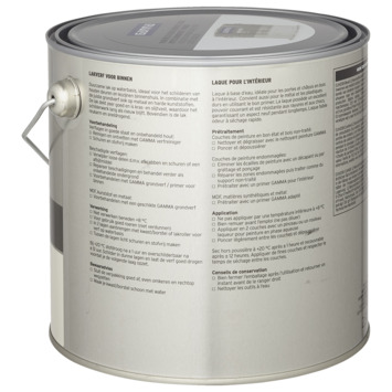 Voor een optimaal resultaat van de GAMMA binnenlak behandel je de ondergrond eerst met de GAMMA grondverf voor binnen. Het blik heeft een inhoud van 2,5 liter, dit is voldoende voor een oppervlakte van ongeveer 30 m². Een uur na het aanbrengen van de verf is deze reeds stofdroog, na 20 uur kan je de volgende laag aanbrengen. Verwerk de verf bij temperaturen tussen de 8 en 25°C.