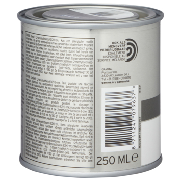 Voor een optimaal resultaat van de GAMMA binnenlak behandel je de ondergrond eerst met de GAMMA grondverf voor binnen. Het blik heeft een inhoud van 250 milliliter, dit is voldoende voor een oppervlakte van ongeveer 3 m². Een uur na het aanbrengen van de verf is deze reeds stofdroog, na 20 uur kan je de volgende laag aanbrengen. Verwerk de verf bij temperaturen tussen de 8 en 25°C.