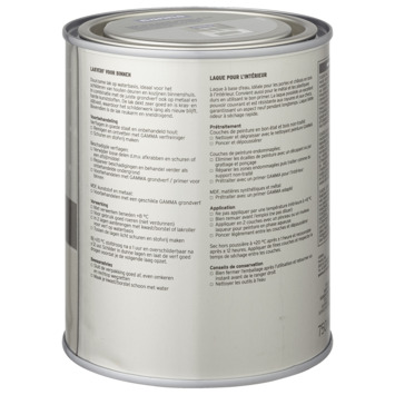 Voor een optimaal resultaat van de GAMMA binnenlak behandel je de ondergrond eerst met de GAMMA grondverf voor binnen. Het blik heeft een inhoud van 750 milliliter, dit is voldoende voor een oppervlakte van ongeveer 9 m². Een uur na het aanbrengen van de verf is deze reeds stofdroog, na 20 uur kan je de volgende laag aanbrengen. Verwerk de verf bij temperaturen tussen de 8 en 25°C.