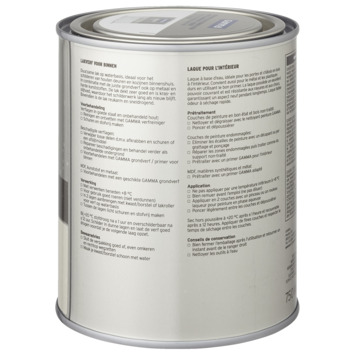 Voor een optimaal resultaat van de GAMMA binnenlak behandel je de ondergrond eerst met de GAMMA grondverf voor binnen. Het blik heeft een inhoud van 750 milliliter, dit is voldoende voor een oppervlakte van ongeveer 9 m². Een uur na het aanbrengen van de verf is deze reeds stofdroog, na 20 uur kan je de volgende laag aanbrengen. Verwerk de verf bij temperaturen tussen de 8 en 25°C.