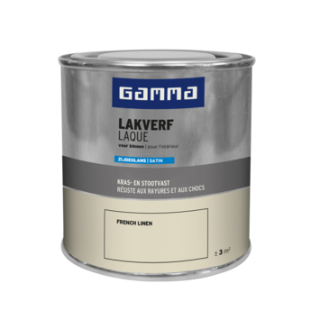 De GAMMA binnenlak zijdeglans french linen 250 ml is geschikt voor het schilderen van onder andere deuren, kozijnen en meubels binnenshuis. Deze kras- en stootvaste lak beschermt oppervlakken goed en geeft ze een strakke zijdeglans afwerking. De lak is op waterbasis, waardoor hij geurarm is en minder snel vergeelt. Je kunt hem direct op hout aanbrengen, en in combinatie met een geschikte grondverf ook op metaal en kunststof. De verf is stofdroog na 1 uur en overschilderbaar na 12 uur.