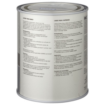 Voor een optimaal resultaat van de GAMMA binnenlak behandel je de ondergrond eerst met de GAMMA grondverf voor binnen. Het blik heeft een inhoud van 750 milliliter, dit is voldoende voor een oppervlakte van ongeveer 9 m². Een uur na het aanbrengen van de verf is deze reeds stofdroog, na 20 uur kan je de volgende laag aanbrengen. Verwerk de verf bij temperaturen tussen de 8 en 25°C.