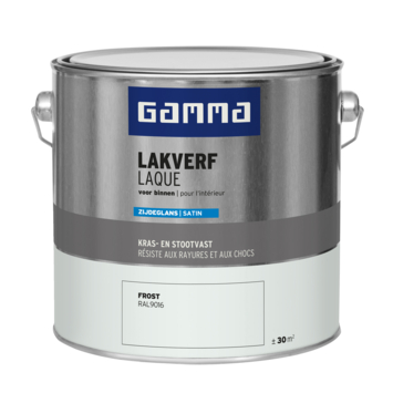 De GAMMA binnenlak zijdeglans RAL 9016 frost 2,5 liter is geschikt voor het schilderen van onder andere deuren, kozijnen en meubels binnenshuis. Deze kras- en stootvaste lak beschermt oppervlakken goed en geeft ze een strakke zijdeglans afwerking. De lak is op waterbasis, waardoor hij geurarm is en minder snel vergeelt. Je kunt hem direct op hout aanbrengen, en in combinatie met een geschikte grondverf ook op metaal en kunststof. De verf is stofdroog na 1 uur en overschilderbaar na 12 uur.