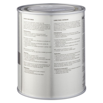 Voor een optimaal resultaat van de GAMMA binnenlak behandel je de ondergrond eerst met de GAMMA grondverf voor binnen. Het blik heeft een inhoud van 750 milliliter, dit is voldoende voor een oppervlakte van ongeveer 9 m². Een uur na het aanbrengen van de verf is deze reeds stofdroog, na 20 uur kan je de volgende laag aanbrengen. Verwerk de verf bij temperaturen tussen de 8 en 25°C.