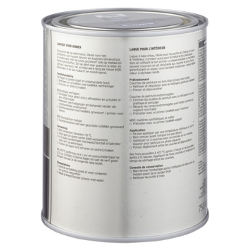 Voor een optimaal resultaat van de GAMMA binnenlak behandel je de ondergrond eerst met de GAMMA grondverf voor binnen. Het blik heeft een inhoud van 750 milliliter, dit is voldoende voor een oppervlakte van ongeveer 9 m². Een uur na het aanbrengen van de verf is deze reeds stofdroog, na 20 uur kan je de volgende laag aanbrengen. Verwerk de verf bij temperaturen tussen de 8 en 25°C.
