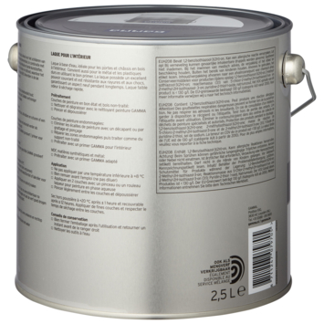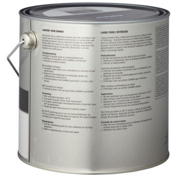 Voor een optimaal resultaat van de GAMMA binnenlak behandel je de ondergrond eerst met de GAMMA grondverf voor binnen. Het blik heeft een inhoud van 2,5 liter, dit is voldoende voor een oppervlakte van ongeveer 30 m². Een uur na het aanbrengen van de verf is deze reeds stofdroog, na 20 uur kan je de volgende laag aanbrengen. Verwerk de verf bij temperaturen tussen de 8 en 25°C.