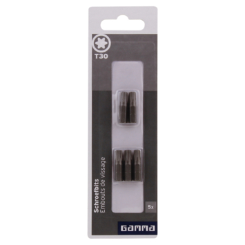 De Gamma schroefbit S2 T30 25MM een accessoire die op een boormachine geplaatst kan worden om vervolgens de functie van een schroevendraaier over te nemen. Voordelen hierbij zijn; een grotere kracht en draaisnelheid die geleverd kan worden tegen geringe inspanning. De verpakking bevat 5 bitjes met een Torx aandrijving.