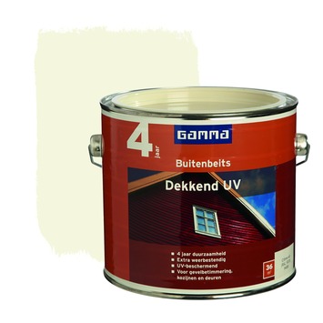 GAMMA buitenbeits dekkend UV crème wit 2,5 liter is ideaal voor het langdurig beschermen van hoogwaardig hout zoals daklijsten en gevelbetimmeringen. Deze glanzende, dekkende beits is een oplosmiddel houdend product en beschikbaar in vele populaire kleuren. Het product is weersbestendig, waterafstotend, UV-bestendig en vochtregulerend. Het rendement van één blik van 2,5 liter is ongeveer 36 m2. Op onbehandeld hout is het aan te bevelen om 3 lagen aan te brengen, op hout in goede staat volstaan 2 lagen. Gebruik van rondverf is niet nodig.