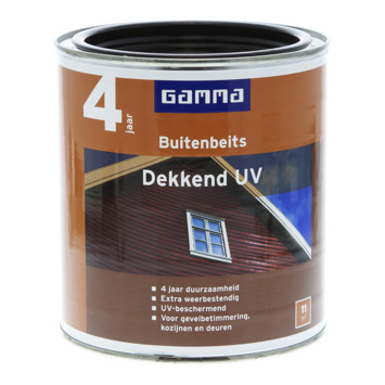 GAMMA buitenbeits dekkend UV diep zwart 750 ml is ideaal voor het langdurig beschermen van hoogwaardig hout zoals daklijsten en gevelbetimmeringen. Deze glanzende, dekkende beits is een oplosmiddel houdend product en beschikbaar in vele populaire kleuren. Het product is weersbestendig, waterafstotend, UV-bestendig en vochtregulerend. Het rendement van één blik van 750 ml is ongeveer 11 m2. Op onbehandeld hout is het aan te bevelen om 3 lagen aan te brengen, op hout in goede staat volstaan 2 lagen. Gebruik van grondverf is niet nodig.