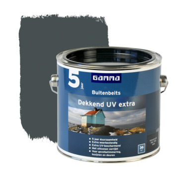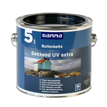 GAMMA buitenbeits dekkend UV extra antraciet grijs 2,5 liter is ideaal voor het langdurig beschermen van hoogwaardig hout zoals buitendeuren en buitenkozijnen. Door de toevoeging van siliconen kan een duurzaamheid van 5 jaar worden gegarandeerd. Deze glanzende beits is een oplosmiddel houdend product en beschikbaar in diverse populaire dekkende en transparante kleuren. Het product is weersbestendig, waterafstotend, UV-bestendig en vochtregulerend. Het rendement van één blik van 2,5 liter is ongeveer 36 m2. Op onbehandeld hout is het aan te bevelen om 3 lagen aan te brengen, op hout in goede staat volstaan 2 lagen. Gebruik van grondverf is niet nodig.