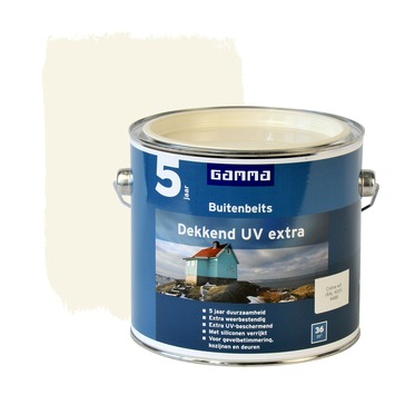 GAMMA buitenbeits dekkend UV extra crème wit 2,5 liter is ideaal voor het langdurig beschermen van hoogwaardig hout zoals buitendeuren en buitenkozijnen. Door de toevoeging van siliconen kan een duurzaamheid van 5 jaar worden gegarandeerd. Deze glanzende beits is een oplosmiddel houdend product en beschikbaar in diverse populaire dekkende en transparante kleuren. Het product is weersbestendig, waterafstotend, UV-bestendig en vochtregulerend. Het rendement van één blik van 2,5 liter is ongeveer 36 m2. Op onbehandeld hout is het aan te bevelen om 3 lagen aan te brengen, op hout in goede staat volstaan 2 lagen. Gebruik van grondverf is niet nodig.