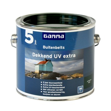 GAMMA buitenbeits dekkend UV extra jachtgroen 2,5 liter is ideaal voor het langdurig beschermen van hoogwaardig hout zoals buitendeuren en buitenkozijnen. Door de toevoeging van siliconen kan een duurzaamheid van 5 jaar worden gegarandeerd. Deze glanzende beits is een oplosmiddel houdend product en beschikbaar in diverse populaire dekkende en transparante kleuren. Het product is weersbestendig, waterafstotend, UV-bestendig en vochtregulerend. Het rendement van één blik van 2,5 liter is ongeveer 36 m2. Op onbehandeld hout is het aan te bevelen om 3 lagen aan te brengen, op hout in goede staat volstaan 2 lagen. Gebruik van grondverf is niet nodig.