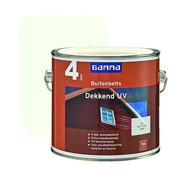 GAMMA buitenbeits dekkend UV RAL 9010 gebroken wit 2,5 liter is ideaal voor het langdurig beschermen van hoogwaardig hout zoals daklijsten en gevelbetimmeringen. Deze glanzende, dekkende beits is een oplosmiddel houdend product en beschikbaar in vele populaire kleuren. Het product is weersbestendig, waterafstotend, UV-bestendig en vochtregulerend. Het rendement van één blik van 2,5 liter is ongeveer 36 m2. Op onbehandeld hout is het aan te bevelen om 3 lagen aan te brengen, op hout in goede staat volstaan 2 lagen. Gebruik van rondverf is niet nodig.