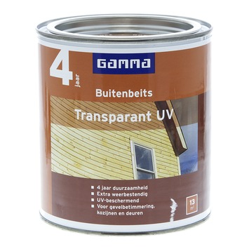 GAMMA buitenbeits transparant UV donker eiken 750 ml is ideaal voor het langdurig beschermen van hoogwaardig hout zoals daklijsten en gevelbetimmeringen. Deze glanzende beits is een oplosmiddel houdend product en beschikbaar in diverse populaire kleuren. Het product is weersbestendig, waterafstotend, UV-bestendig en vochtregulerend. Het rendement van één blik van 750 ml is ongeveer 13 m2. Op onbehandeld hout is het aan te bevelen om 3 lagen aan te brengen, op hout in goede staat volstaan 2 lagen. Gebruik van grondverf is niet nodig.
