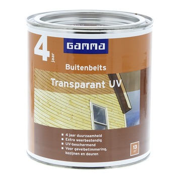 GAMMA buitenbeits transparant UV mahonie 750 ml is ideaal voor het langdurig beschermen van hoogwaardig hout zoals daklijsten en gevelbetimmeringen. Deze glanzende beits is een oplosmiddel houdend product en beschikbaar in diverse populaire kleuren. Het product is weersbestendig, waterafstotend, UV-bestendig en vochtregulerend. Het rendement van één blik van 750 ml is ongeveer 13 m2. Op onbehandeld hout is het aan te bevelen om 3 lagen aan te brengen, op hout in goede staat volstaan 2 lagen. Gebruik van grondverf is niet nodig.