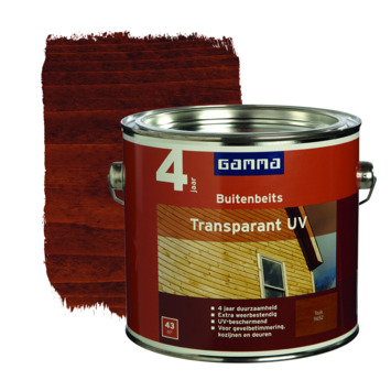 GAMMA buitenbeits transparant UV teak 2,5 liter is ideaal voor het langdurig beschermen van hoogwaardig hout zoals daklijsten en gevelbetimmeringen. Deze glanzende beits is een oplosmiddel houdend product en beschikbaar in diverse populaire kleuren. Het product is weersbestendig, waterafstotend, UV-bestendig en vochtregulerend. Het rendement van één blik van 2,5 liter is ongeveer 43 m2. Op onbehandeld hout is het aan te bevelen om 3 lagen aan te brengen, op hout in goede staat volstaan 2 lagen. Gebruik van grondverf is niet nodig.