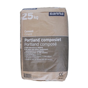 Dit cement dient als basismateriaal voor het maken van beton, zandcement, metselspecie en voegspecie. Met het cement van Portland composiet CEM II/B-M (S-LL) 32,5 R metsel je in korte tijd stevige en stabiele muren. Het GAMMA Cement 25 kg heeft namelijk een verwerkingstijd van ongeveer 120 minuten. Je mengt het cement met water en zand tot een grijze massa. Let er daarbij dan op dat je het cement binnen twee uur verwerkt. Op die manier levert het GAMMA Cement het beste resultaat op. Gewicht: 25kg.