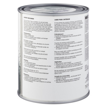 Voor een optimaal resultaat van deze GAMMA Color Intens binnenlak behandel je de ondergrond eerst met de GAMMA Color Intens grondverf. Het blik heeft een inhoud van 750 milliliter, dit is voldoende voor een oppervlakte van ongeveer 7,5 m². Drie uur na het aanbrengen van de verf is deze reeds stofdroog, na 24 uur kan je de volgende laag aanbrengen. Verwerk de verf bij temperaturen tussen de 8 en 25°C.