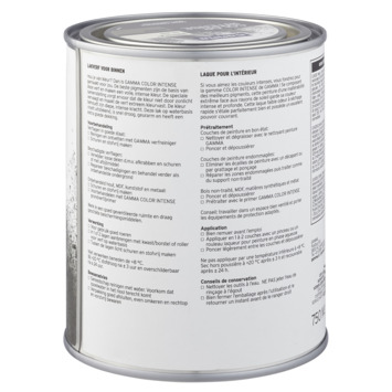 Voor een optimaal resultaat van deze GAMMA Color Intens binnenlak behandel je de ondergrond eerst met de GAMMA Color Intens grondverf. Het blik heeft een inhoud van 750 milliliter, dit is voldoende voor een oppervlakte van ongeveer 7,5 m². Drie uur na het aanbrengen van de verf is deze reeds stofdroog, na 24 uur kan je de volgende laag aanbrengen. Verwerk de verf bij temperaturen tussen de 8 en 25°C.