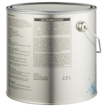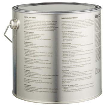 GAMMA Color Intense is een kleurconcept voor binnen schilderwerk van hoge kwaliteit en diepe kleurkracht. Deze GAMMA color intense binnenlak is een verf op waterbasis. Verf op waterbasis is de beste keus voor binnenshuis. Het is geurarm en blijft langer mooi van kleur. Deze verf is geschikt voor hout, en in combinatie met de daarvoor geschikte grondverf, ook op metaal en kunststoffen. Door gebruik van de beste pigmenten in deze verf, behoudt je de diepe en intense kleurkracht. De lak op waterbasis vloeit uitstekend, en heeft een extra goede dekking. Voor een optimaal resultaat van deze GAMMA Color Intens binnenlak behandel je de ondergrond eerst met de GAMMA Color Intens grondverf. Drie uur na het aanbrengen van de verf is deze reeds stofdroog, na 24 uur kan je de volgende laag aanbrengen. De lak is te gebruiken als afwerking van nieuw onbehandelde delen, maar ook op bestaand schilderwerk of om meubels een nieuwe uitstraling te geven. De binnenlak is eenvoudig aan te brengen met een kwast of lakroller voor verf op waterbasis.