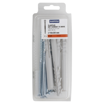 De GAMMA Slagplug nylon Ø 10x120mm met schroef is geschikt voor meervoudige bevestigingen van niet-dragende systemen in metselwerk, beton en cellenbeton. In metselwerk van geperforeerde baksteen zorgen de spreidzones van de plug voor een gelijkmatige krachtverdeling, in cellenbeton en massief materiaal voegen ze zich samen tot een lang spreidelement. Met de universeelschroef tx verzonkenkop (lengte 125mm) is de constructieplug zeer geschikt voor bevestigingen in de interieurbouw, zoals voor ramen, kapstokken, hangkasten of televisieconsoles. Voor optimale montage adviseren wij een boorgatdiepte van 130mm. Een verpakking bevat 4 stuks.