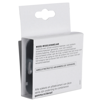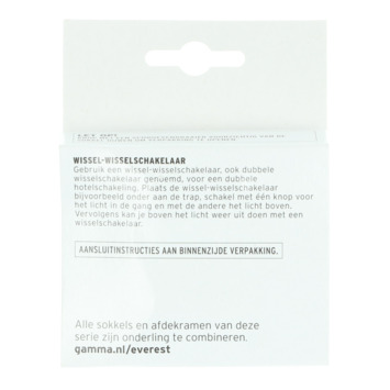 Met de GAMMA Denali Wissel-wisselschakelaar Mat Zwart kun je twee lichtpunten afzonderlijk van elkaar bedienen vanaf meerdere plaatsen. Daarnaast kun je een wissel-wisselschakelaar ook gebruiken om een hotelschakeling te creëren. Met één druk op de knop zet je dan bijvoorbeeld het licht in de gang aan, met een druk op de andere knop bedient je de lamp op de overloop. Een wissel-wisselschakelaar wordt ook wel Dubbele wisselschakelaar genoemd. Montage van deze wissel-wisselschakelaar is eenvoudig dankzij de gebruiksvriendelijke installatiehandleiding en het bijgevoegde aansluitschema.