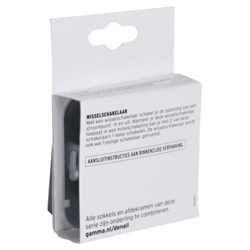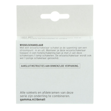 Met de GAMMA Denali Wisselschakelaar Mat Zwart kun je een lamp aan- of uitzetten. Ook kun je deze schakelaar gebruiken in een hotelschakeling zodat je één lichtpunt vanaf twee verschillende schakelpunten kunt bedienen. Een wisselschakelaar wordt ook wel 1-polige schakelaar genoemd. Montage van deze aluminiumkleurige Everest-wisselschakelaar is eenvoudig dankzij de gebruiksvriendelijke installatiehandleiding en het bijgevoegde aansluitschema.