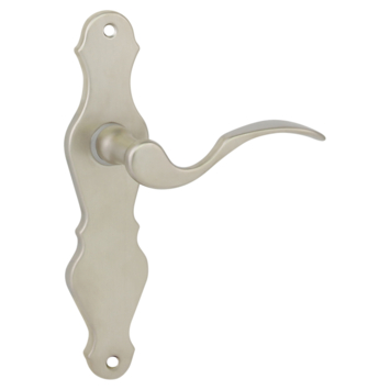 Deurkruk. Type Lepel mat vernikkeld (RVS look), op langschild blind (zonder sleutelgat). De deurklink is vast gemonteerd op het schild en is voorzien van een veer waardoor de kruk niet gaat hangen. In deze serie zijn ook de WC63/8 en sleutel 56mm beschikbaar. Het is mogelijk om in de bouwmarkt afwijkende WC en cilinder maten te bestellen.