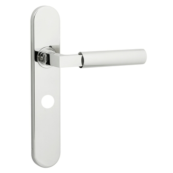 Deurkruk. Type London RVS 304 kwaliteit gepolijst, op langschild voor wc, toilet of badkamer 63mm met stift 8mm. De deurklink is vast gemonteerd op het schild en is voorzien van een veer waardoor de kruk niet gaat hangen. In deze serie is ook een blind schild, sleutel 56mm en een rond rozet beschikbaar. Geen afwijkende maten voor WC, sleutel en cilinder beschikbaar.