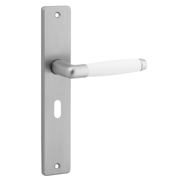 Deurkruk. Type Retro mat vernikkeld (RVS look) / wit, op langschild met sleutelgat 56mm. De deurklink is vast gemonteerd op het schild en is voorzien van een veer waardoor de kruk niet gaat hangen. In deze serie zijn ook de WC 63/8, blind schild en rond rozet beschikbaar. Het is mogelijk om in de bouwmarkt afwijkende WC, sleutel en cilindermaten te bestellen.