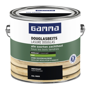 De GAMMA Douglasbeits mat RAL 9005 diep zwart 2,5 liter is een dekkende beits die bescherming biedt tot 5 jaar. Deze beits is perfect voor het behandelen van fijn bezaagde of glad geschaafde potdeksel planken van douglas, grenen, vuren, lariks en andere soorten zachthout. Schuren is niet nodig bij fijn bezaagd hout tussen de verflagen, maar oude verflagen moeten goed gereinigd worden voordat je gaat verven. De GAMMA Douglasbeits dringt diep in het hout en maakt het sterk vochtregulerend, weerbestendig en waterafstotend. Hoewel de beits de houtnerf afdekt, blijft het hout toch goed vochtregulerend. Het is niet nodig om het hout voor te behandelen met grondverf.