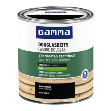 De GAMMA Douglasbeits mat RAL 9005 diep zwart 750 ml is een dekkende beits die bescherming biedt tot 5 jaar. Deze beits is perfect voor het behandelen van fijn bezaagde of glad geschaafde potdeksel planken van douglas, grenen, vuren, lariks en andere soorten zachthout. Schuren is niet nodig bij fijn bezaagd hout tussen de verflagen, maar oude verflagen moeten goed gereinigd worden voordat je gaat verven. De GAMMA Douglasbeits dringt diep in het hout en maakt het sterk vochtregulerend, weerbestendig en waterafstotend. Hoewel de beits de houtnerf afdekt, blijft het hout toch goed vochtregulerend. Het is niet nodig om het hout voor te behandelen met grondverf.