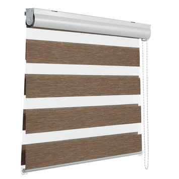 De GAMMA duo rolgordijn 180 x 210cm 4306 houtlook bruin combineert op een uitstekende wijze sfeer en stijl met elkaar. De duo rolgordijn is zowel decoratief als functioneel en bestaat uit twee lagen stof. Deze lagen stof hebben horizontale banen die transparant of niet-transparant zijn. Door de lagen langs elkaar de schuiven, wordt er gespeeld met de lichtinval. Indien de duo rolgordijn halfopen is, krijgt u een gefilterde lichtinval. Als de duo rolgordijn volledig gesloten is, dan heeft u maximale lichtwering en privacy. Door de verschillende standen, is het product ideaal voor de woonkamer. De duo rolgordijn is eenvoudig zelf in de breedte in te korten en wordt compleet geleverd met montage-instructie en -materialen. Door het sfeervolle karakter en de mogelijkheid om zelf de lichtinval te bepalen, is de GAMMA duo rolgordijn 180 x 210cm 4306 houtlook bruin perfect als sfeervolle raamdecoratie.
