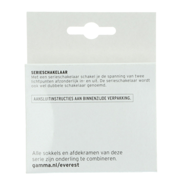 Met de GAMMA Everest Serieschakelaar Aluminium kun je twee lampen afzonderlijk van elkaar in- en uitschakelen. De serieschakelaar wordt ook wel een Dubbele schakelaar genoemd. Montage van deze aluminiumkleurige Everest-serieschakelaar is eenvoudig dankzij de gebruiksvriendelijke installatiehandleiding en het bijgevoegde aansluitschema. De Everest-serie van GAMMA is een strakke en moderne serie schakelmateriaal, in diverse kleuren en van uitstekende kwaliteit.