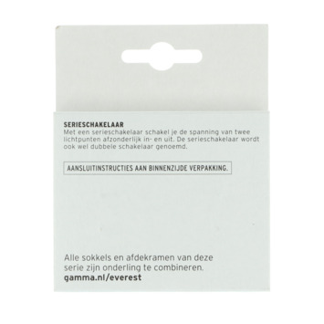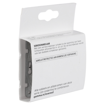 De GAMMA Everest Serieschakelaar Antraciet kun je gebruiken om twee lichtpunten afzonderlijk van elkaar te bedienen. Een serieschakelaar wordt ook wel Dubbele schakelaar genoemd. Je kunt deze niet toepassen in een wisselschakeling. Montage van deze antracietkleurige Everest serieschakelaar is eenvoudig dankzij de gebruiksvriendelijke installatiehandleiding en het bijgevoegde aansluitschema.