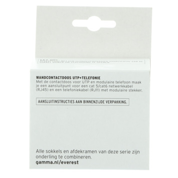 Met de GAMMA Everest Stopcontact UTP en Telefonie Wit kun je eenvoudig zelf je eigen thuisnetwerk aanleggen. Met deze doos maak je een aansluitpunt voor een netwerkkabel (RJ45) van cat5/cat6 (voor computers, modems, spelcomputers of smart-tv's) en een telefoonkabel (modulair). Montage is eenvoudig dankzij de gebruiksvriendelijke installatiehandleiding en het bijgevoegde aansluitschema.