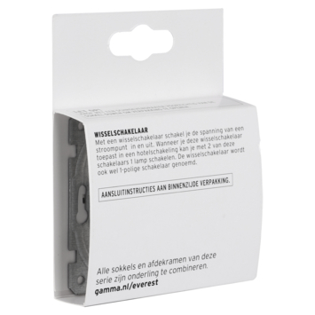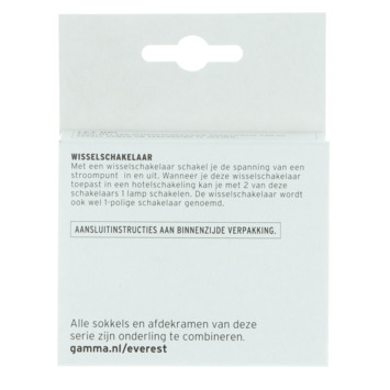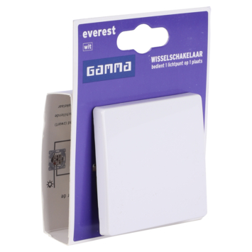 Met de GAMMA Everest Wisselschakelaar Wit kun je een lamp aan- of uitzetten. Ook kun je deze schakelaar gebruiken in een hotelschakeling zodat je één lichtpunt vanaf twee verschillende schakelpunten kunt bedienen. Een wisselschakelaar wordt ook wel 1-polige schakelaar genoemd. Montage van deze witte Everest-wisselschakelaar is eenvoudig dankzij de gebruiksvriendelijke installatiehandleiding en het bijgevoegde aansluitschema.