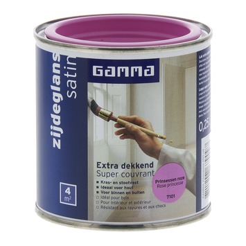 GAMMA Extra Dekkend lak prinsessen roze zijdeglans 250 ml is een extra dekkende, stoot- en krasvaste lak op terpentinebasis. Deze zijdeglans verf is geschikt voor decoratieve toepassingen binnenshuis op zowel hout, metaal als kunststof. Het product is ook weersbestendig en te gebruiken voor toepassingen buitenshuis. Eén blik van 250 ml volstaat voor het schilderen van een oppervlakte van 4 m2 er van uitgaande dat in de vereiste dunne lagen wordt geschilderd. Naast de standaard beschikbare kleuren is deze lak in meer dan 30.000 verschillende kleuren te verkrijgen bij onze verfmengbalie in de GAMMA bouwmarkt.