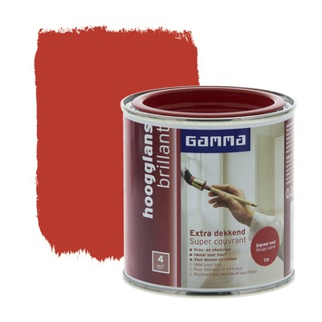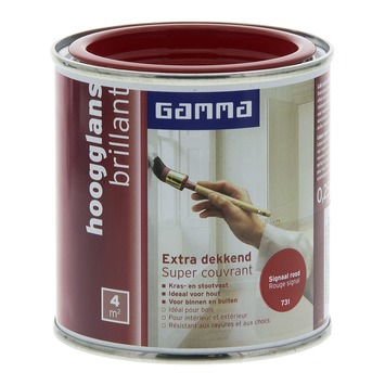 GAMMA Extra Dekkend lak signaal rood hoogglans 250 ml is een extra dekkende, stoot- en krasvaste lak op terpentinebasis. Deze hoogglans verf is geschikt voor decoratieve toepassingen binnenshuis op zowel hout, metaal als kunststof. Het product is ook weersbestendig en te gebruiken voor toepassingen buitenshuis. Eén blik van 250 ml volstaat voor het schilderen van een oppervlakte van 4 m2 er van uitgaande dat in de vereiste dunne lagen wordt geschilderd. Naast de standaard beschikbare kleuren is deze lak in meer dan 30.000 verschillende kleuren te verkrijgen bij onze verfmengbalie in de GAMMA bouwmarkt.