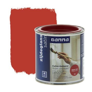 GAMMA Extra Dekkend lak signaal rood zijdeglans 250 ml is een extra dekkende, stoot- en krasvaste lak op terpentinebasis. Deze zijdeglans verf is geschikt voor decoratieve toepassingen binnenshuis op zowel hout, metaal als kunststof. Het product is ook weersbestendig en te gebruiken voor toepassingen buitenshuis. Eén blik van 250 ml volstaat voor het schilderen van een oppervlakte van 4 m2 er van uitgaande dat in de vereiste dunne lagen wordt geschilderd. Naast de standaard beschikbare kleuren is deze lak in meer dan 30.000 verschillende kleuren te verkrijgen bij onze verfmengbalie in de GAMMA bouwmarkt.